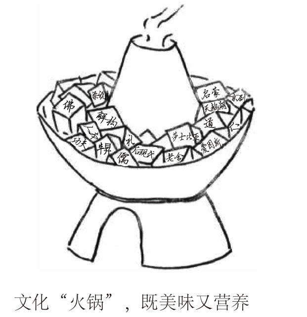(下方是一幅画,画的是一个火锅,火锅里有标有“佛”“儒”“科学”“启蒙”等不同文化元素的食材,火锅下方有文字:文化“火锅”,既美味又营养)