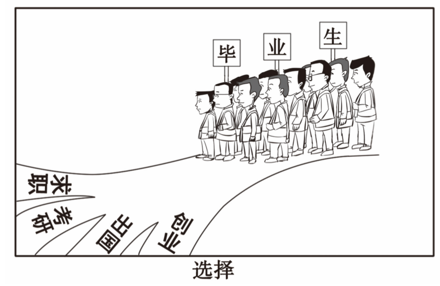 (下方配有一幅漫画:一群标有 “毕业生” 字样的人物,面临着标有 “考研”“考公”“留学”“创业” 等不同方向的道路。)