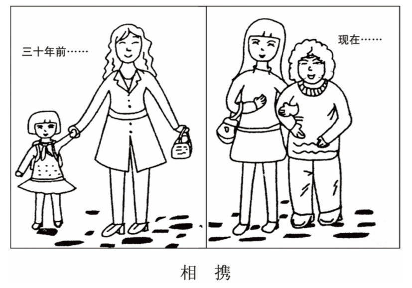 (这幅漫画分为左右两部分,左侧标注“三十年前……”,画中一位年轻女子牵着一个小女孩的手,女子提着物品;右侧标注“现在……”,画中长大的女孩搀扶着已显苍老的女子。下方有“相携”二字,展现了母女(或亲人)之间跨越时光的相互陪伴与扶持。)