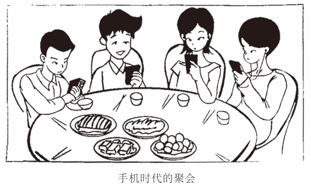 (图片描述:一群人围坐在摆满各式菜肴的餐桌旁,然而,他们没有相互交流,每个人都沉浸在自己的手机里。)
