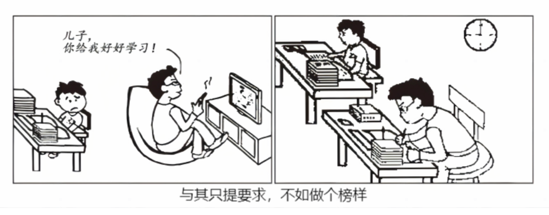 (左侧图:父亲坐着,一边玩手机、看电视,一边对儿子说“儿子,你给我好好学习!” 右侧图:父亲和儿子一样在书桌前学习,桌上有书籍 下方文字:与其只提要求,不如做个榜样 )