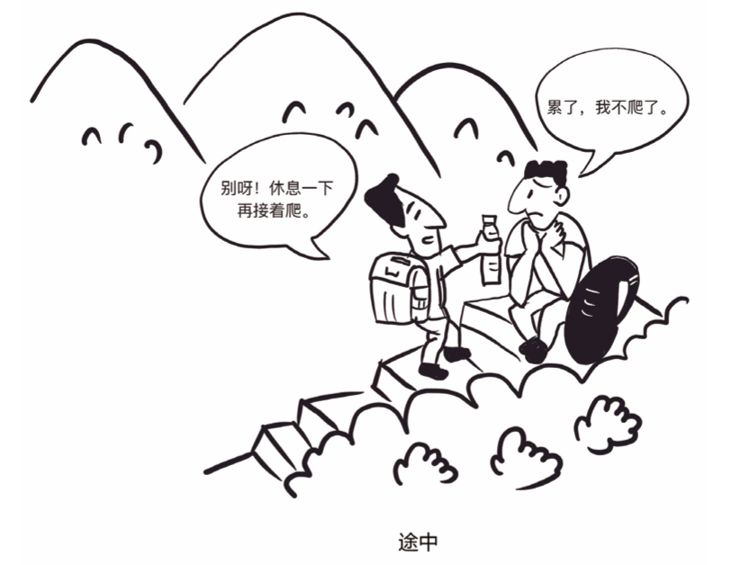 (下方是一幅漫画,包含两个人物、对话气泡、山水等元素,下方标注“途 中” ,人物对话为“别呀,休息一下再接着爬”“累了,我不爬了” )