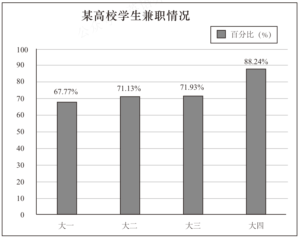 (图表标题为 “某高校学生兼职情况”,纵轴为 “人数百分比”,横轴为大学年级(大一、大二、大三、大四)。各年级学生兼职的人数百分比分别为:大一 67.77%、大二 71.13%、大三 71.93%、大四 88.24%。)