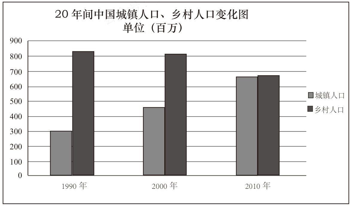 (图表信息:标题为 “20 年间中国城镇人口与乡村人口变化图”;图例中,斜线柱代表城镇人口,空心柱代表乡村人口;数据(单位:百万):1990 年:城镇人口 300,乡村人口 834;2000 年:城镇人口 458,乡村人口 807;2010 年:城镇人口 666,乡村人口 674。)