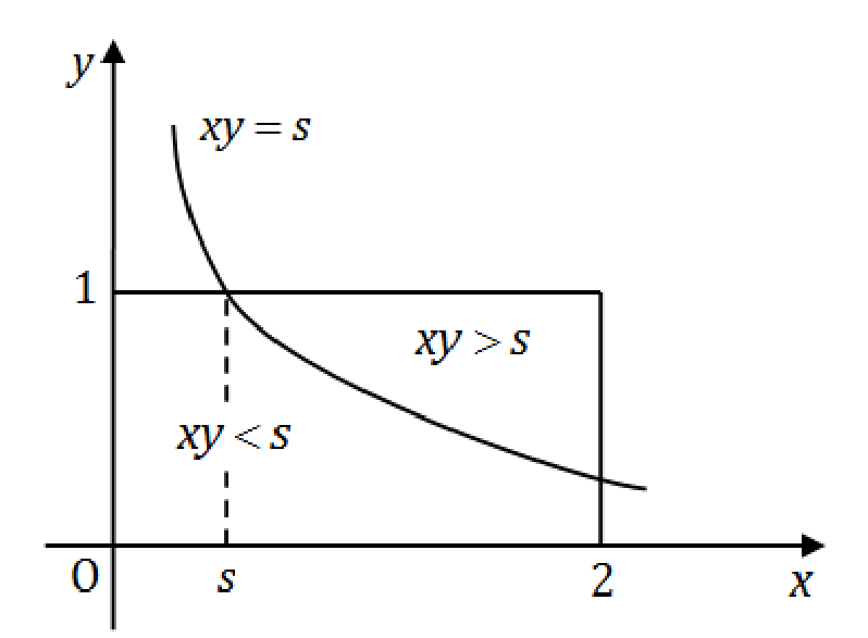 F(s)=P{S≤s}=P{XY≤s}=1−P{XY>s}=1−∬xy>s21dxdy=1−21∫s2dx∫xs1dy=2s(1+ln2−lns).