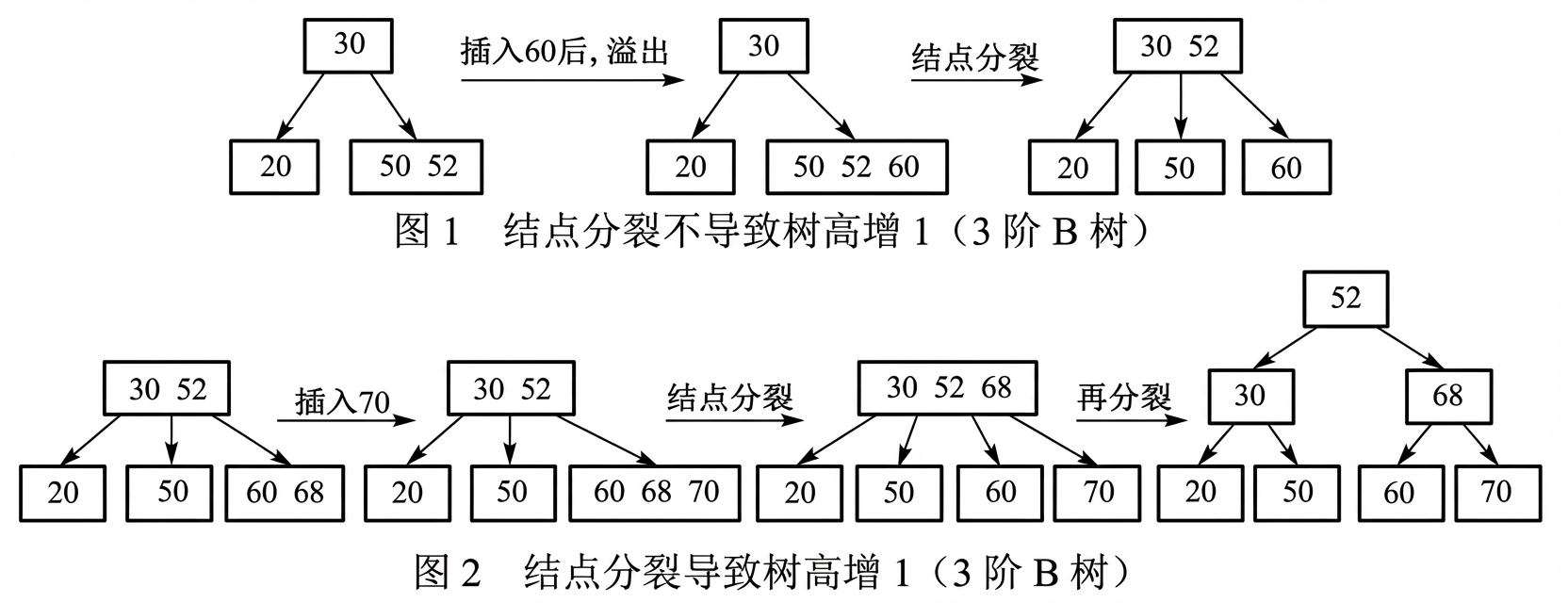 结点的分裂不一定会使树高增加 1,如图 1 所示;只有当分裂传递到根结点并使根结点也分裂时,树高才会增加 1,如图 2 所示,因此 IV 错误。