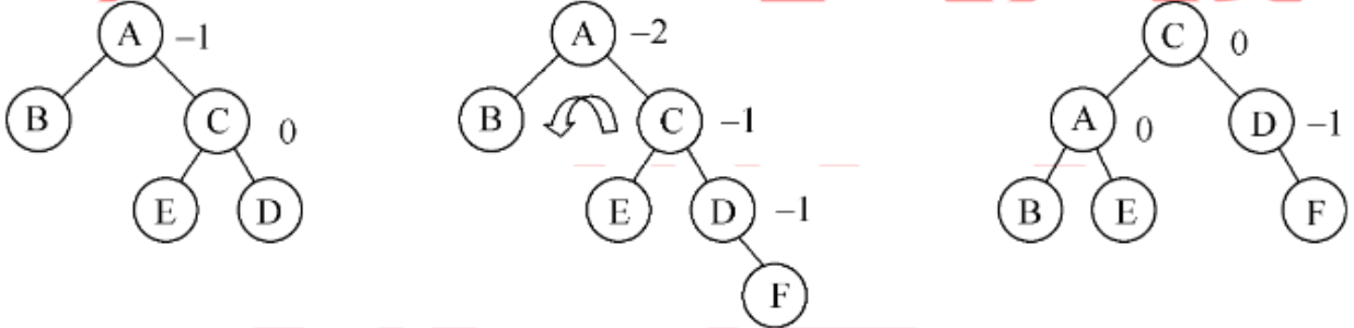 【解析】 考查平衡二叉树的旋转。由于在结点 A 的右孩子(R)的右子树(R)上插入新结点 F,A 的平衡因子由 -1 减至 -2,导致以 A 为根的子树失去平衡,需要进行 RR 旋转(左单旋)。