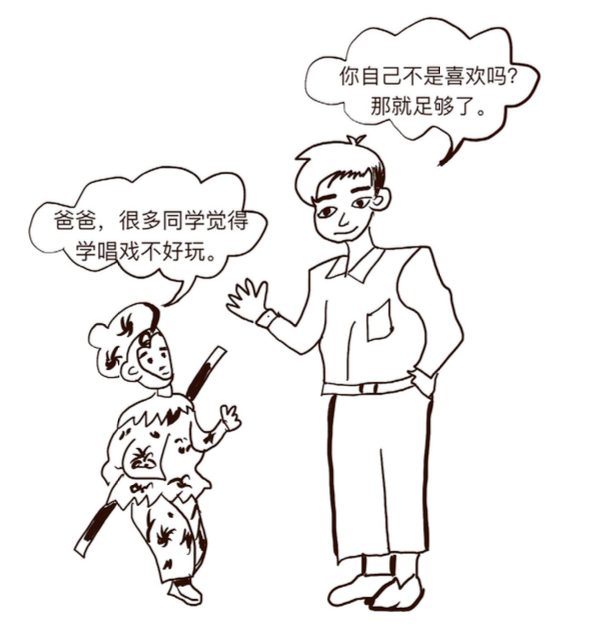 (图中左侧小女孩(穿戏服、拿长杆)说:“爸爸,很多同学觉得学唱戏不好玩。”右侧成年男子(着简约服饰、手抬起)回应:“你自己不是喜欢吗?那就足够了。”)