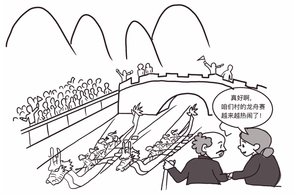 (图中有一些卡通画及文字:“真好啊!咱们村的龙舟赛越赛越热闹了。” 画里呈现了河边桥上有人围观,河里有龙舟竞赛,岸边有老人感慨的场景 。)