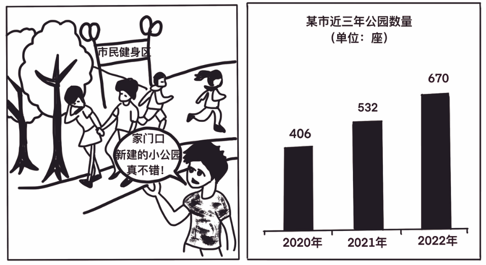 注:图片本身包含的漫画对话文字"家门口新修的公园真不错!“和柱状图标题"某市近三年公园数量(单位/座)“及其数据(2020:406/2021:532/2022:670)