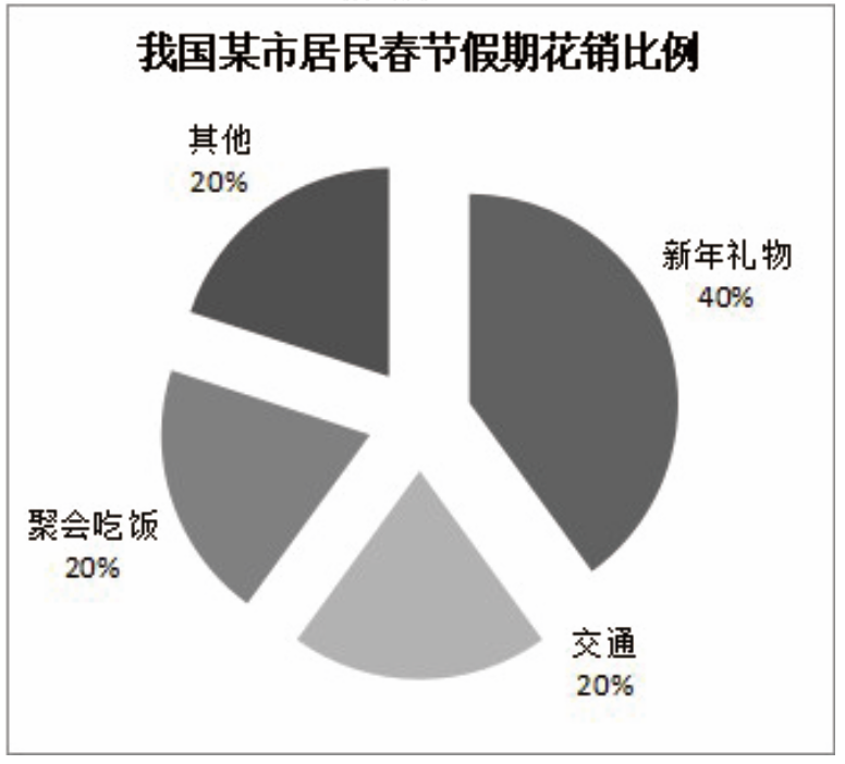 饼图构成:新年礼物:40%,交通:20%,聚会吃饭:20%,其他:20%)