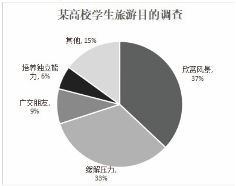 (图表内容:饼图标题为 “某高校学生旅游目的调查”,各旅游目的及对应比例分别为:欣赏风景 37%、缓解压力 33%、广交朋友 9%、培养独立能力 6%、其他 15%。)