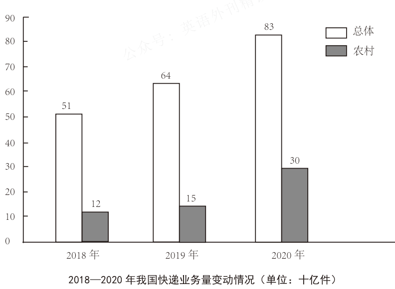 (图表内容:纵轴数值从10到90,横轴为2018、2019、2020年。2018年总体对应51,农村对应12;2019年总体对应64,农村对应15;2020年总体对应83,农村对应30。图例中,浅灰色代表总体,深灰色代表农村。)