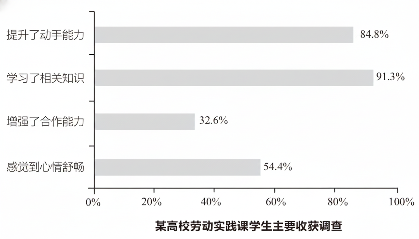 (图表内容:某高校劳动实践课学生主要收获调查显示,91.3%的学生认为学习了相关知识,84.8%的学生觉得提升了动手能力,54.4%的学生感觉到心情舒畅,32.6%的学生表示增强了合作能力。)